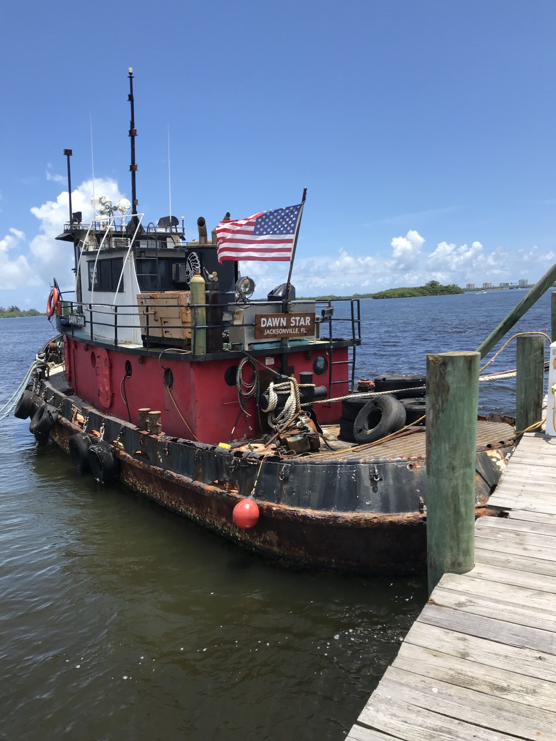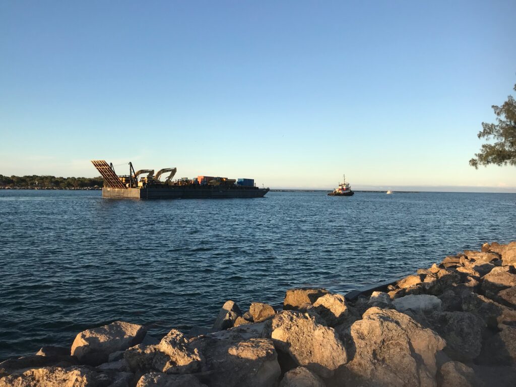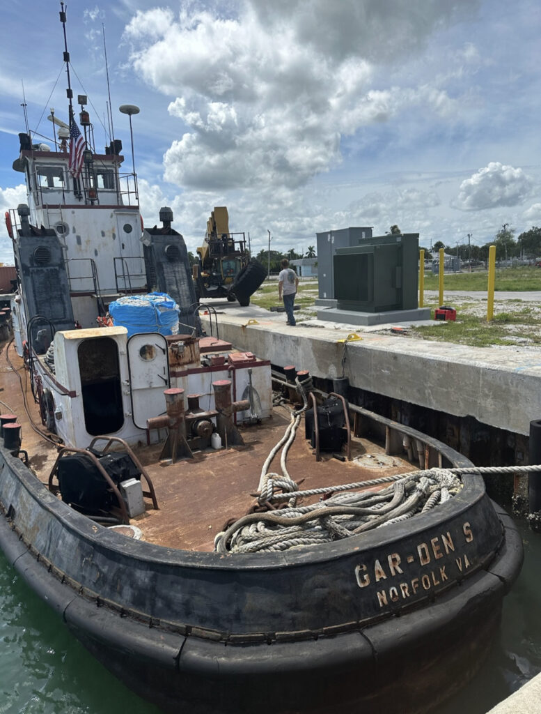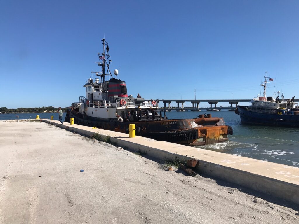 A flotilla of dredge support vessels from Texas left long dormant in Miami. Towed to Fort Pierce to be restored at Fort Marine.